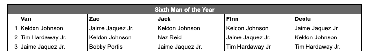 Zac: This debate seemingly comes down to preference: Jaime Jaquez Jr. vs. Keldon Johnson. Both are deserving candidates, but it’s Jaquez’s leap as a playmaker that gives him the edge for me. I also can’t ignore the fact that Johnson put up nearly identical numbers to last season (albeit slightly more efficiently), when he didn’t receive a single 6MOY vote. Shout-out to Bobby Portis too, who had another strong year despite the Bucks’ chaos—and should already have at least one of these awards.