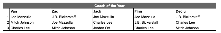 Jack: This one was pretty easy for me. Mazzulla has done an unbelievable job turning a team that many thought was heading for a Pacers-esque gap year into a legit title contender. The way this dude has turned other teams’ trash into the Celtics’ treasure is truly astounding. Special shoutouts to Lee and Ott for how they transformed their teams from the previous season’s results.