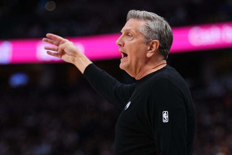 Minnesota Timberwolves head coach Chris Finch reacts during the first half in Game 2 of a first-round NBA playoffs basketball series against the Denver Nuggets, Monday, April 20, 2026, in Denver. (AP Photo/Jack Dempsey)
