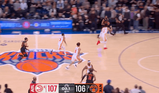 Yes, Bridges also had to worry about Dyson Daniels flying back on defense, and Johnson is athletic enough to contest a shot attempt at the cup. At the moment he catches the ball, however, Bridges is already bailing toward the corner with his first step rather than pressing his advantage to draw a foul on Johnson … to the point that he nearly steps on the referee’s foot!