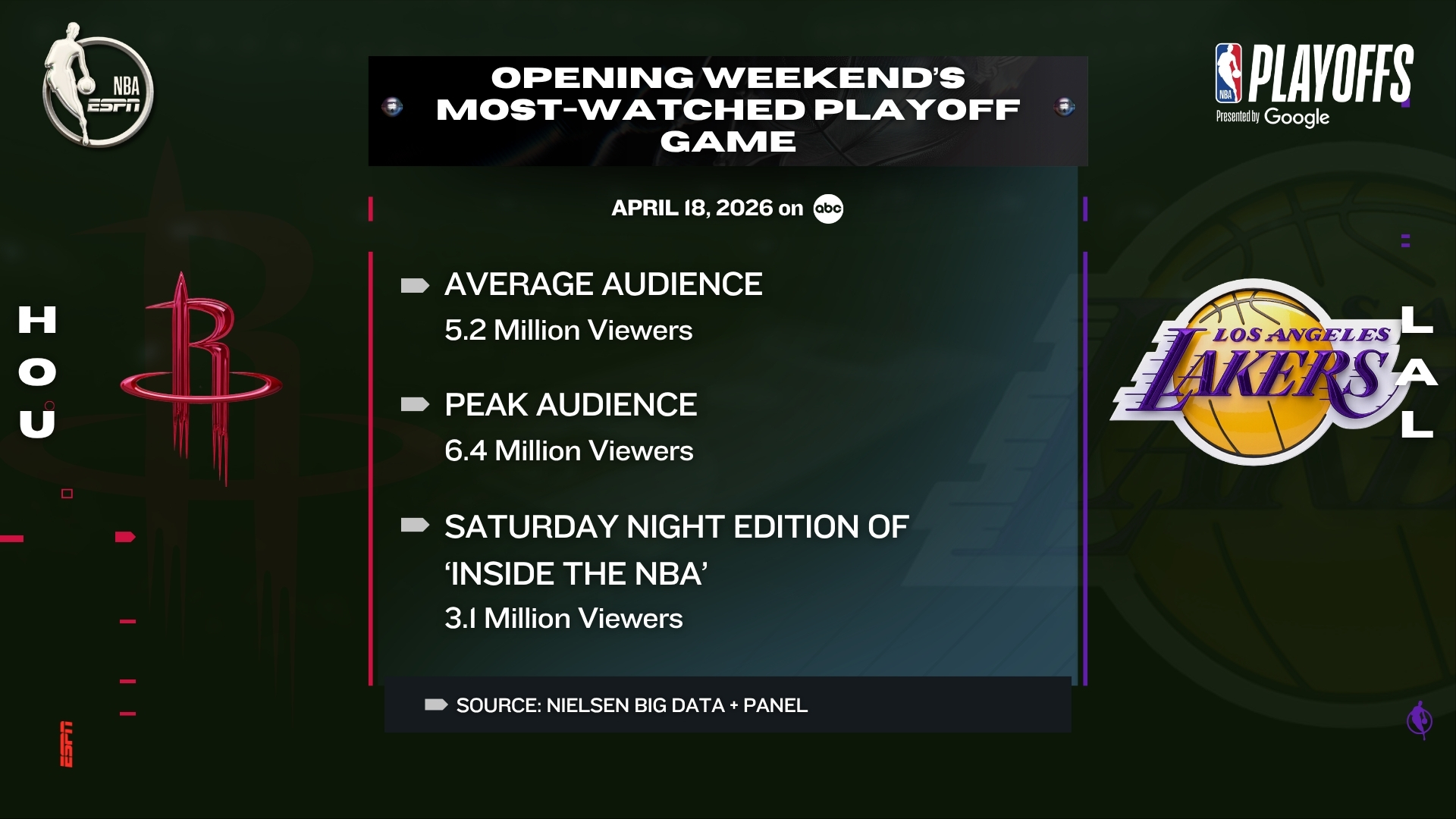 ESPN tipped off the opening weekend of the NBA Playoffs presented by Google in strong fashion, delivering the most‑watched NBA game of the weekend. Saturday’s Houston Rockets vs. Los Angeles Lakers matchup on ABC averaged 5.2 million viewers, peaking at 6.4 million viewers during the 11 p.m. ET quarter‑hour.