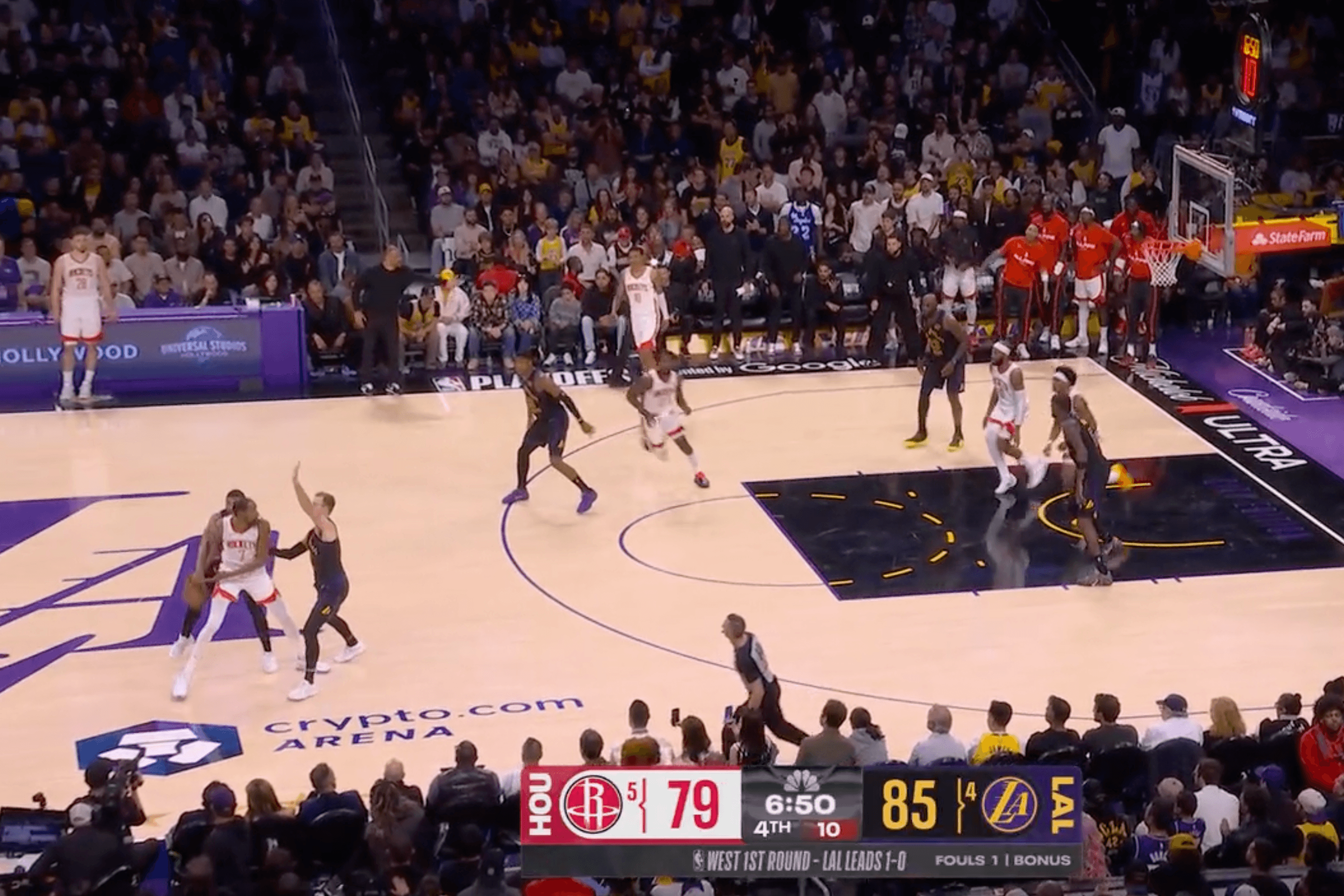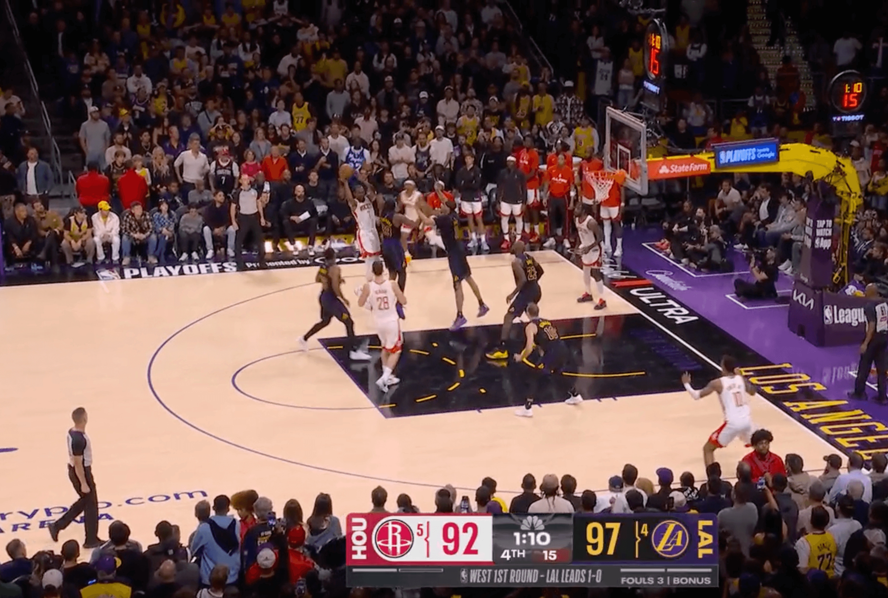 Jabari Smith Jr. was in the weakside corner, with Luke Kennard prepared to sprint to a closeout if Durant could even see through the arms of the Lakers. Tari Eason cut through to the dunker spot while being guarded by James, but again, James was more focused on Durant’s decision. That would be the correct inclination, because Durant left his feet, choosing to pass to Şengün inside, and Smart stole the pass.