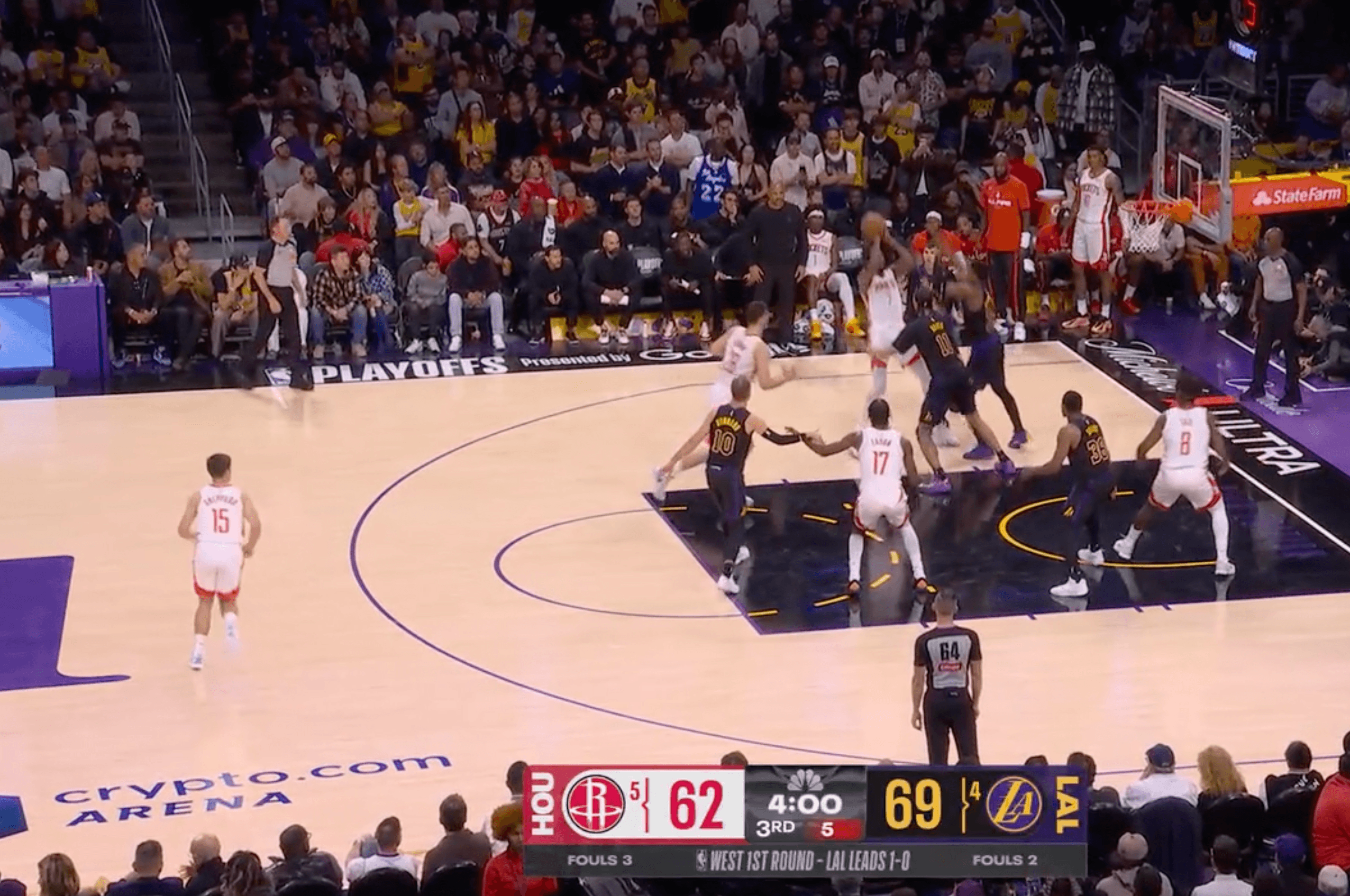 All five Lakers defenders are in the paint following a Durant handoff going left from Şengün. Marcus Smart trailed Durant, while Rui Hachimura practically ignored Şengün to focus on a possible contest of a Durant midrange attempt. Jaxson Hayes was on the strong side, with no reason to fear Amen Thompson in the corner.