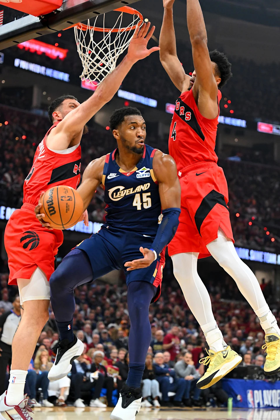 CLEVELAND, OHIO – APRIL 20: Donovan Mitchell #45 of the Cleveland Cavaliers passes around Sandro Mamukelashvili #54 and Scottie Barnes #4 of the Toronto Raptors during the second quarter of Game Two of the Eastern Conference First Round NBA Playoffs at Rocket Arena on April 20, 2026 in Cleveland, Ohio. NOTE TO USER: User expressly acknowledges and agrees that, by downloading and or using this photograph, User is consenting to the terms and conditions of the Getty Images License Agreement. (Photo by Jason Miller/Getty Images)