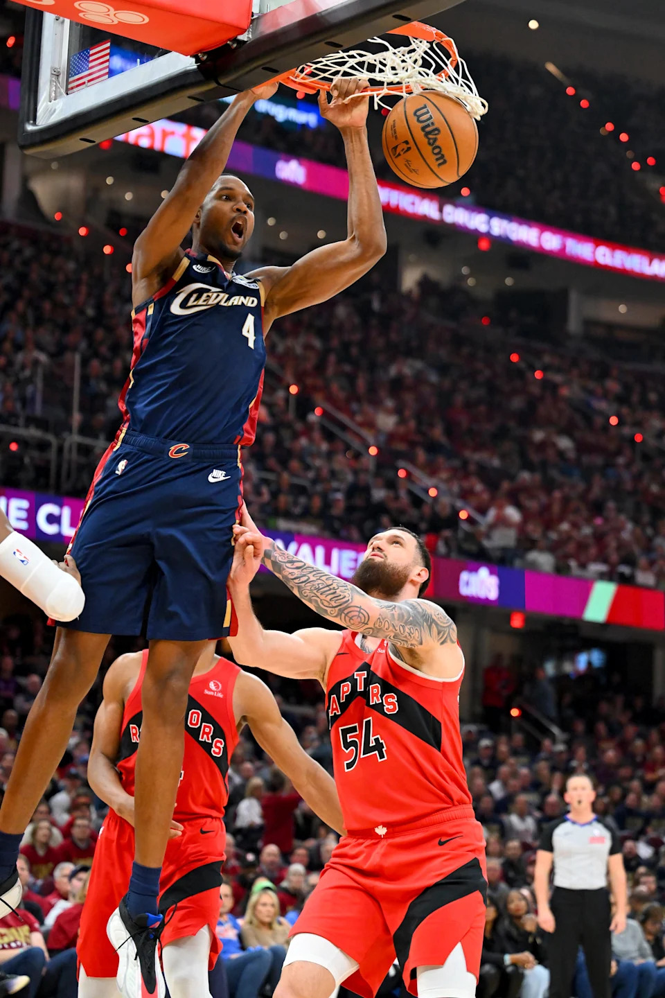 CLEVELAND, OHIO – APRIL 20: Evan Mobley #4 of the Cleveland Cavaliers dunks over Sandro Mamukelashvili #54 of the Toronto Raptors during the second quarter of Game Two of the Eastern Conference First Round NBA Playoffs at Rocket Arena on April 20, 2026 in Cleveland, Ohio. NOTE TO USER: User expressly acknowledges and agrees that, by downloading and or using this photograph, User is consenting to the terms and conditions of the Getty Images License Agreement. (Photo by Jason Miller/Getty Images)