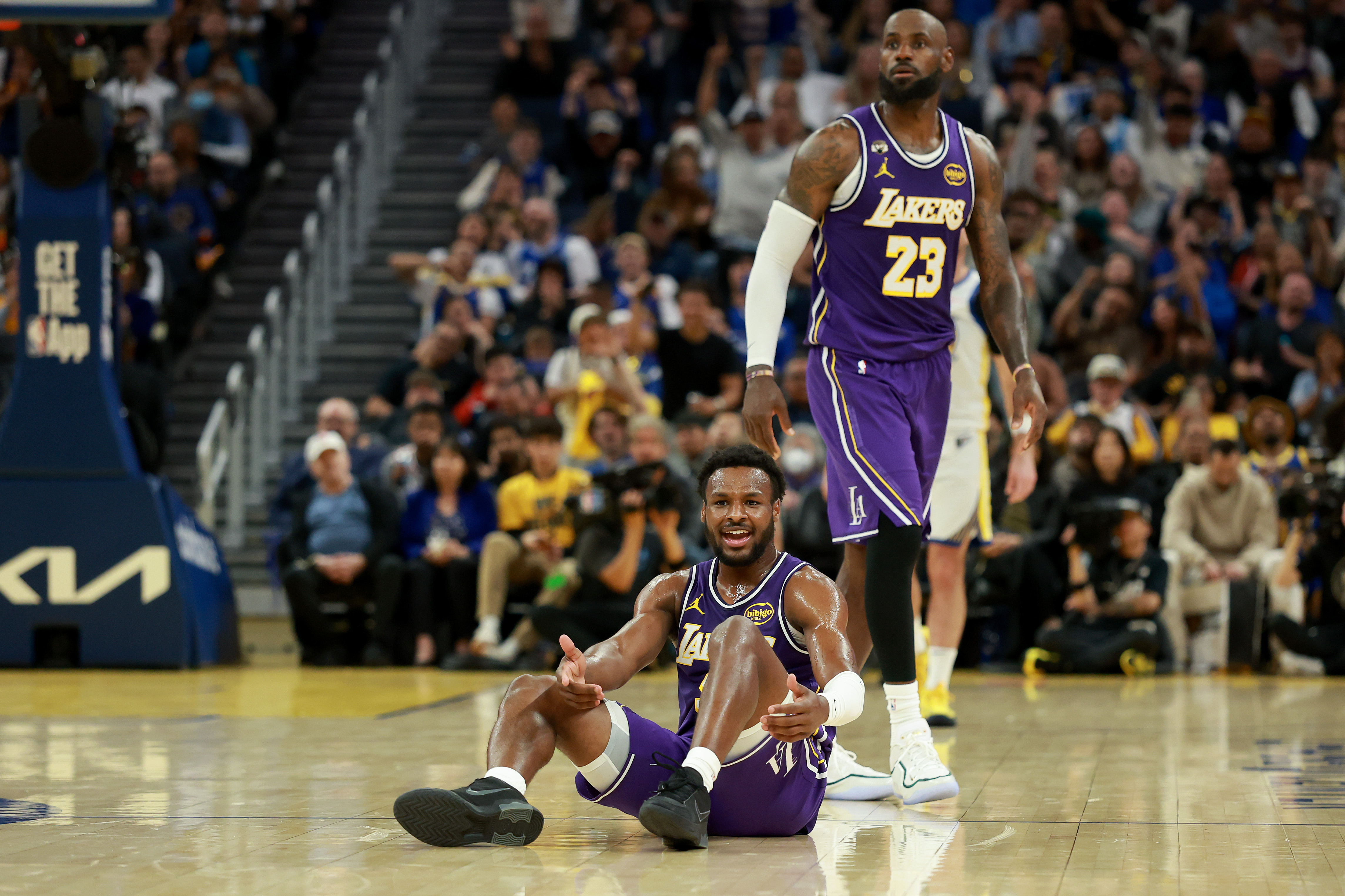 GettyLeBron James #23 of the Los Angeles Lakers and Bronny James #9 look downcourt against the Golden State Warriors during the second half at Chase Center on April 09, 2026 in San Francisco, California.