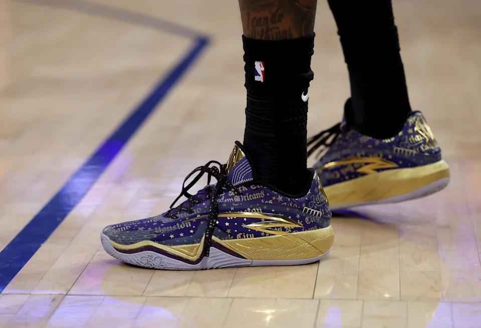 Above, The shoes of Jalen Brunson #11 of the New York Knicks are seen during the first half of Game One of the Eastern Conference First Round NBA Playoffs against the Atlanta Hawks at Madison Square Garden on April 18, 2026, in New York City.