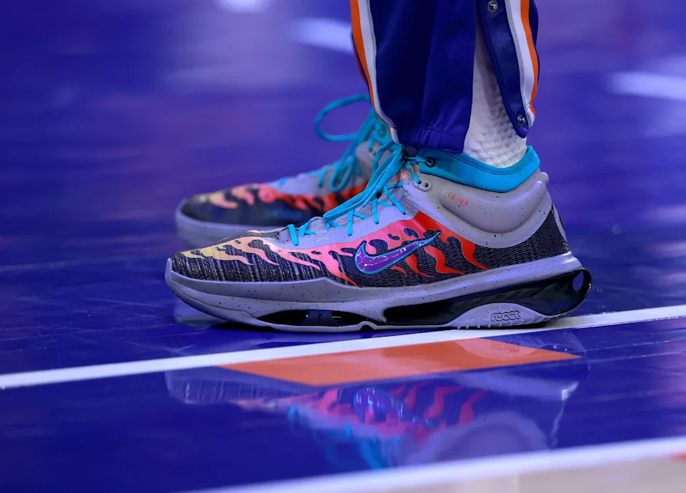 NEW YORK, NEW YORK – APRIL 18: The shoes of Karl-Anthony Towns #32 of the New York Knicks are seen during the first half of Game One of the Eastern Conference First Round NBA Playoffs against the Atlanta Hawks at Madison Square Garden on April 18, 2026 in New York City. NOTE TO USER: User expressly acknowledges and agrees that, by downloading and or using this photograph, User is consenting to the terms and conditions of the Getty Images License Agreement. (Photo by Elsa/Getty Images)