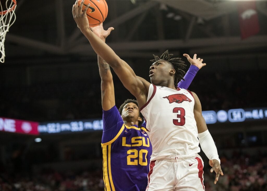 Feb 12, 2025; Fayetteville, Arkansas, USA; Arkansas Razorbacks forward Adou Thiero (3) goes for a layup past LSU Tigers forward Derek Fountain (20) during the second half at Bud Walton Arena. Arkansas won 70-58. Mandatory Credit: Brett Rojo-Imagn Images