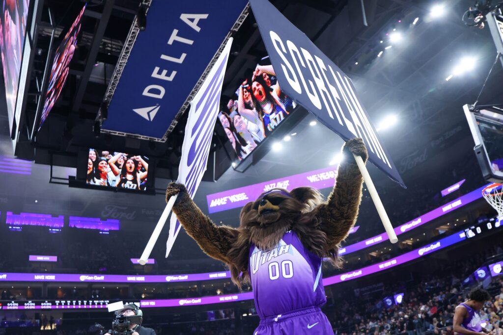 Jan 12, 2025; Salt Lake City, Utah, USA; The Utah Jazz mascot Bear enrages the crowd to cheer before the game against the Brooklyn Nets at Delta Center. Mandatory Credit: Rob Gray-Imagn Images