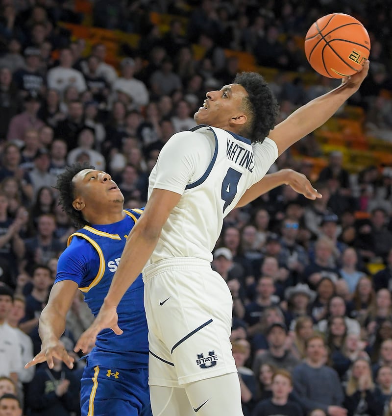 Utah State guard Ian Martinez (4) attempts to dunk the ball as San Jose State guard Jermaine Washington defends in the first half of an NCAA college basketball game Wednesday, Feb. 19, 2025, in Logan, Utah. (Eli Lucero/Herald Journal via AP) | AP