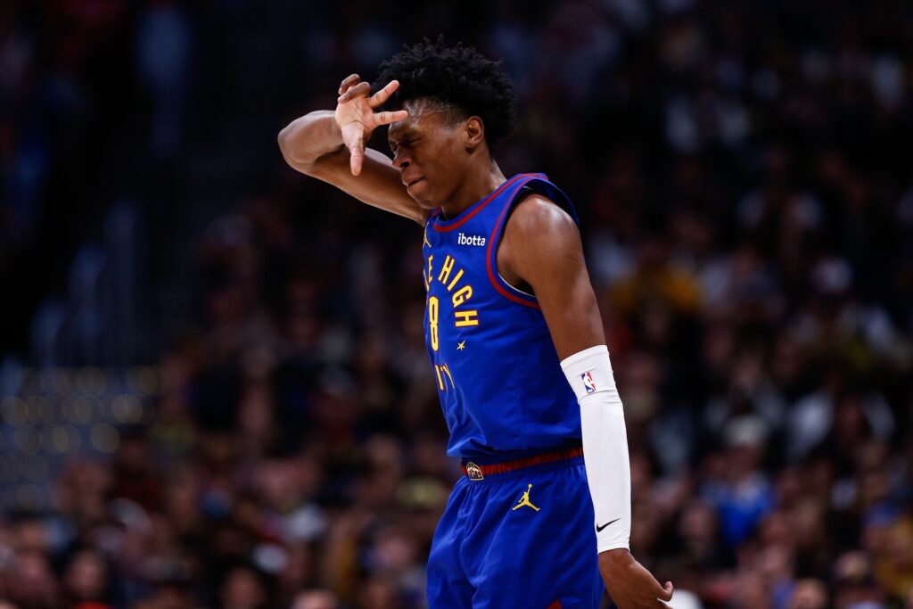 Mar 24, 2025; Denver, Colorado, USA; Denver Nuggets forward Peyton Watson (8) reacts after a basket in the third quarter against the Chicago Bulls at Ball Arena. Mandatory Credit: Isaiah J. Downing-Imagn Images