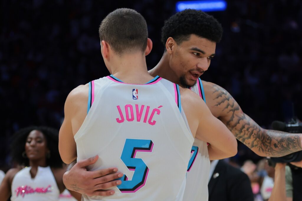 Jan 27, 2025; Miami, Florida, USA; Miami Heat center Kel’el Ware (7) celebrates with forward Nikola Jovic (5) after the game against the Orlando Magic at Kaseya Center. Mandatory Credit: Sam Navarro-Imagn Images