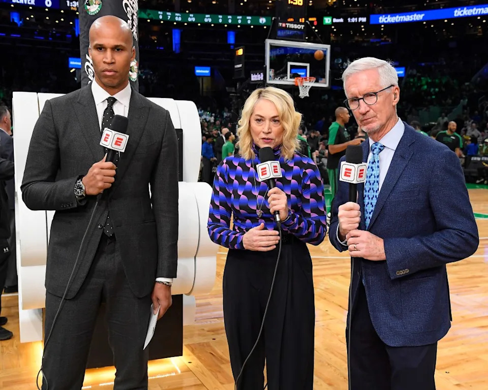 Richard Jefferson, Dorris Burke and Mike Breen speaking before the Denver Nuggets against the Boston Celtics game on March 2, 2025 at TD Garden in Boston, Massachusetts. NBAE via Getty Images
