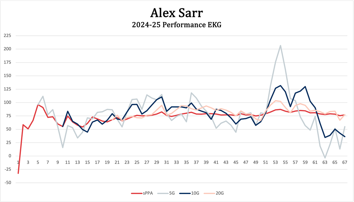 At no point during the season did Sarr’s rolling full-season PPA score crack average. The closest he got was a 96 just five games into the season. He had several five-game stretches that were better than average, including an inspiring 207 over a five-game span in March. He had 10-game stints that topped average in January and again in March, and 20-game periods that were a bit better than average in March.