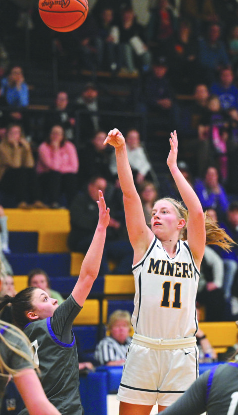 Negaunee’s Aubrey Johnson, right, follows through on a shot during an MHSAA Division 2 girls district tournament championship game played against Gladstone at Lakeview Memorial Gymnasium in Negaunee on March 7. (Photo courtesy Cara Kamps)