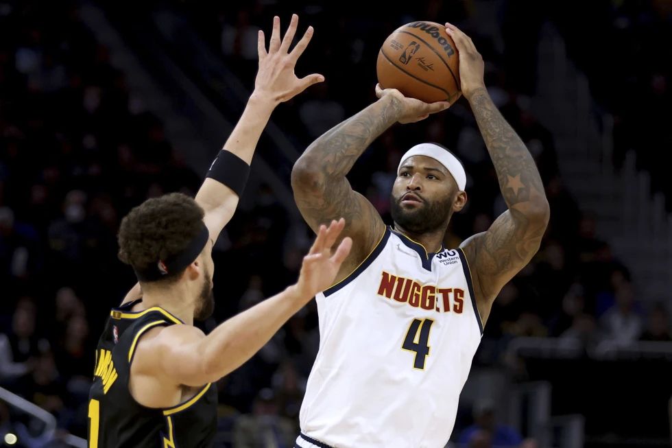 Denver Nuggets center DeMarcus Cousins (4) shoots against Golden State Warriors guard Klay Thompson, left, during the first half of Game 5 of an NBA basketball first-round playoff series in San Francisco, Wednesday, April 27, 2022. (AP Photo/Jed Jacobsohn, file)