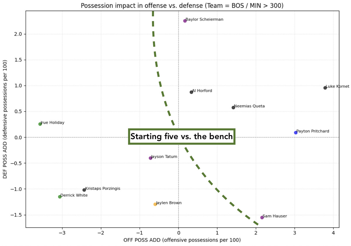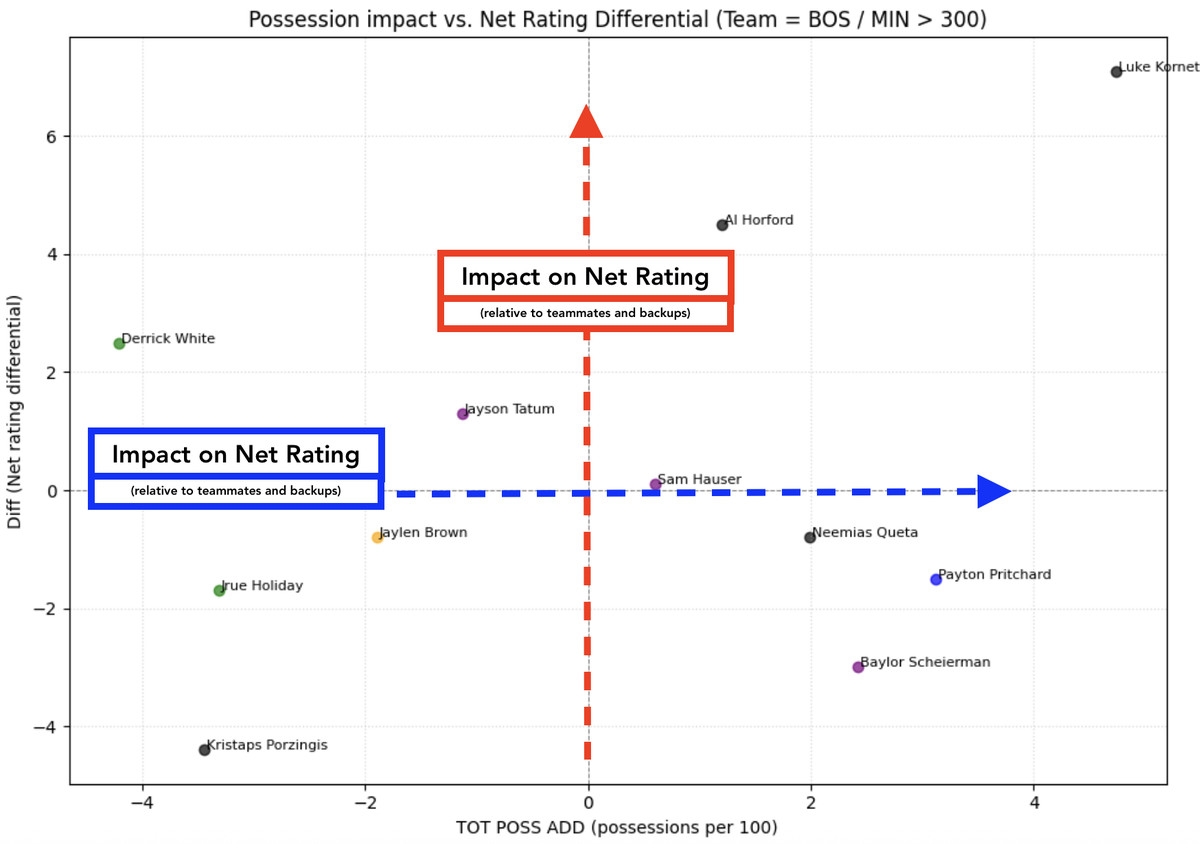 Also, some players were still highly positive despite not performing particularly well in the possession battle—such as Derrick White or Jayson Tatum. There were also players who helped the team dominate the possession battle but weren’t as impactful on net rating, like Pritchard or Neemias Queta. And then, there are three players who underperformed in both: Porzingis, Jrue Holiday, and Jaylen Brown. Over the course of the season, the Celtics were more likely to win the possession battle and have a better net rating when those three were on the bench.