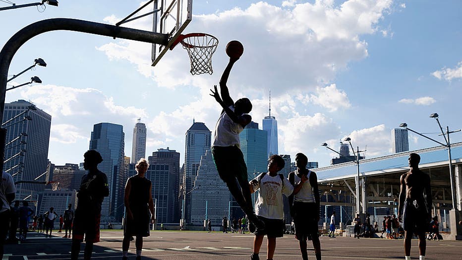 NEW YORK, NY – AUGUST 02: A basketball player soars through the air toward the hoop trying to score during a pick-up game on an outside court on Pier 2 in Brooklyn Bridge Park in front of the Manhattan Skyline with One World Trade Center (1 WTC) on A