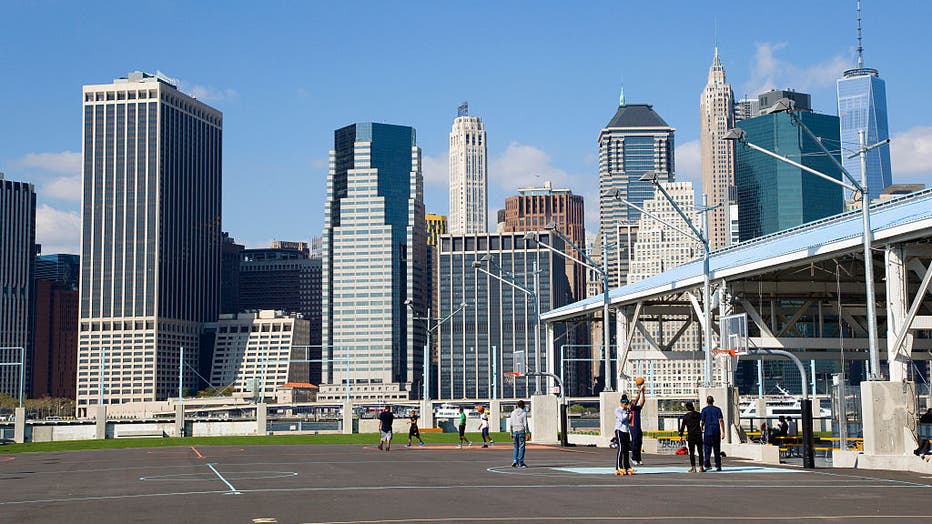 USA, New York, Brooklyn Bridge Park basketball courts on Pier 2 with Lower Manhattan skyscraper skyline beyond. (Photo by: Eye Ubiquitous/Universal Images Group via Getty Images)