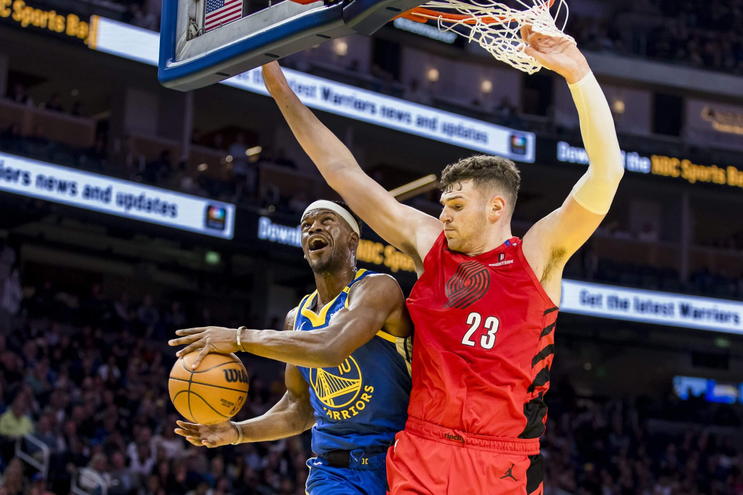 Donovan Clingan protects the rim against Golden State’s Jimmy Butler on Monday. (John Hefti / Imagn Images)Donovan Clingan helps surging Blazers