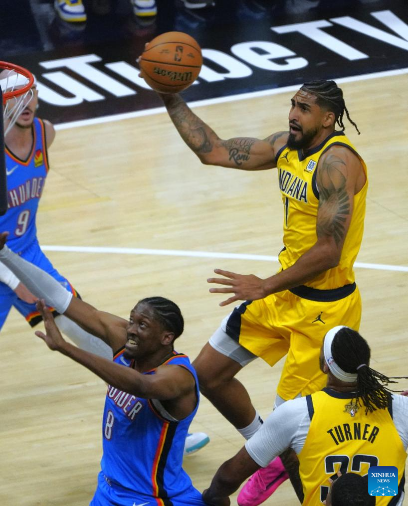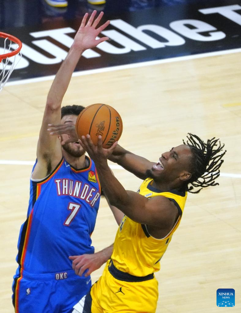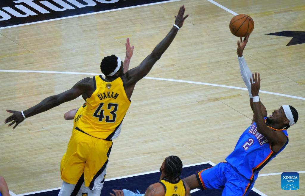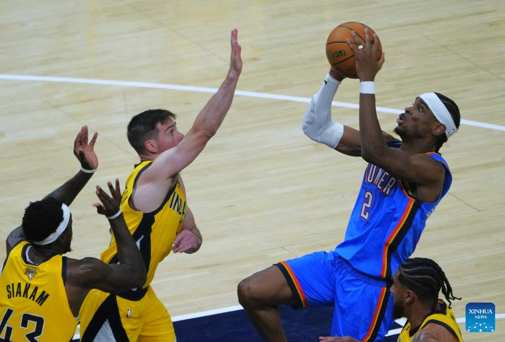 Shai Gilgeous-Alexander (top R) of Oklahoma City Thunder shoots during game four of the 2024-2025 season NBA Finals between Oklahoma City Thunder and Indiana Pacers in Indianapolis, Indiana, the United States, June 13, 2025. (Xinhua/Wu Xiaoling)
