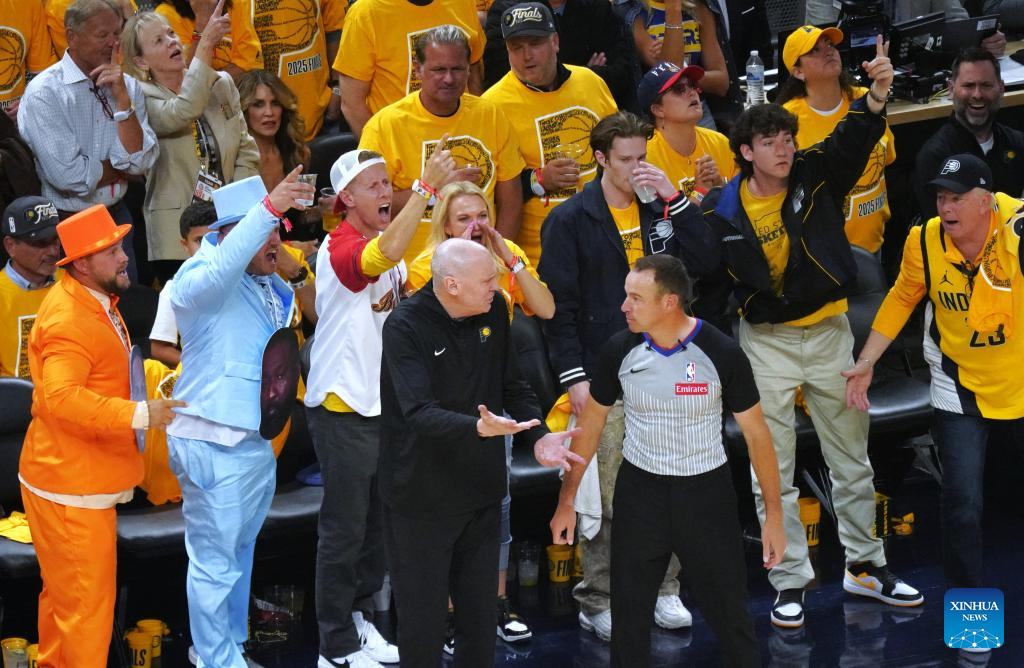 (250614) — INDIANAPOLIS, June 14, 2025 (Xinhua) — Indiana Pacers’ head coach Rick Carlisle (bottom L) communicates with the referee during game four of the 2024-2025 season NBA Finals between Oklahoma City Thunder and Indiana Pacers in Indianapolis, Indiana, the United States, June 13, 2025. (Xinhua/Wu Xiaoling)
