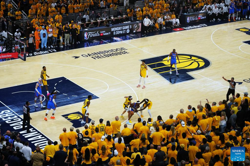 (250614) — INDIANAPOLIS, June 14, 2025 (Xinhua) — Photo taken on June 13, 2025 shows the game four of the 2024-2025 season NBA Finals between Oklahoma City Thunder and Indiana Pacers in Indianapolis, Indiana, the United States. (Xinhua/Wu Xiaoling)