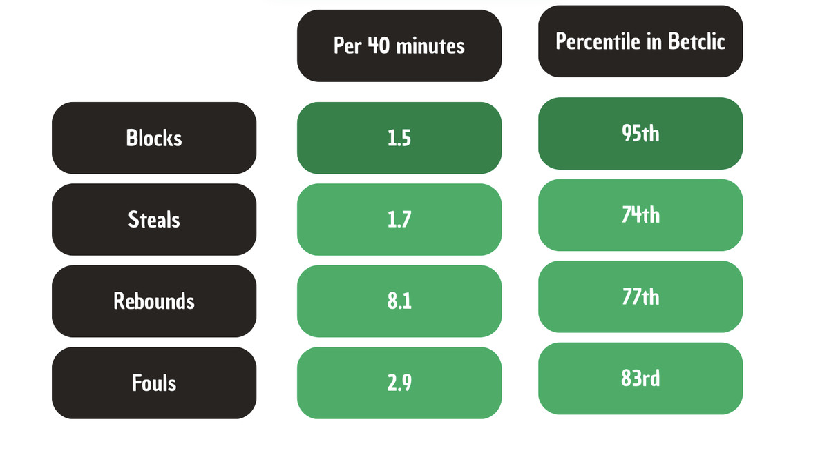 So who else in Betclic Élite combines this level of production and defensive efficiency? No one. Nobody brings this kind of impact on that side of the ball. The only two players who come close to his efficiency are Andre Roberson (the former OKC Thunder player) and Kevarrius Hayes, but both foul a lot more.