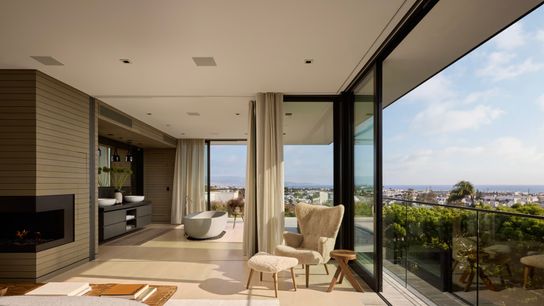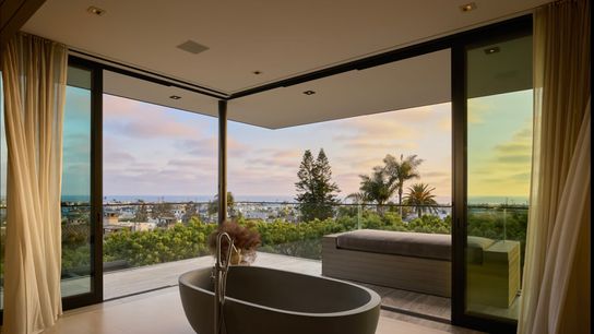 The property, located in the Hill Section of Manhattan Beach, spans more than 8,600 square feet and includes five bedrooms. It was designed by the Los Angeles-based firm KAA Design and completed in 2015, three years after Sharapova purchased the ocean-view lot. The modern residence features striking concrete walls, expansive glass panels, multiple outdoor fireplaces and a lushly landscaped yard that offers both privacy and dramatic views of the Pacific.