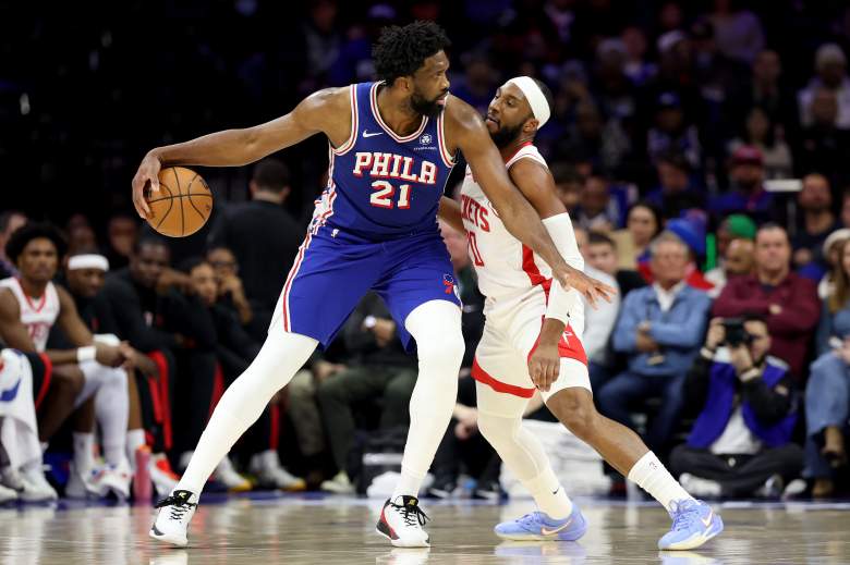 PHILADELPHIA, PENNSYLVANIA – JANUARY 22: Joel Embiid #21 of the Philadelphia 76ers looks on during the first half against the Houston Rockets at Xfinity Mobile Arena on January 22, 2026 in Philadelphia, Pennsylvania. NOTE TO USER: User expressly acknowledges and agrees that, by downloading and or using this photograph, User is consenting to the terms and conditions of the Getty Images License Agreement. (Photo by Emilee Chinn/Getty Images)