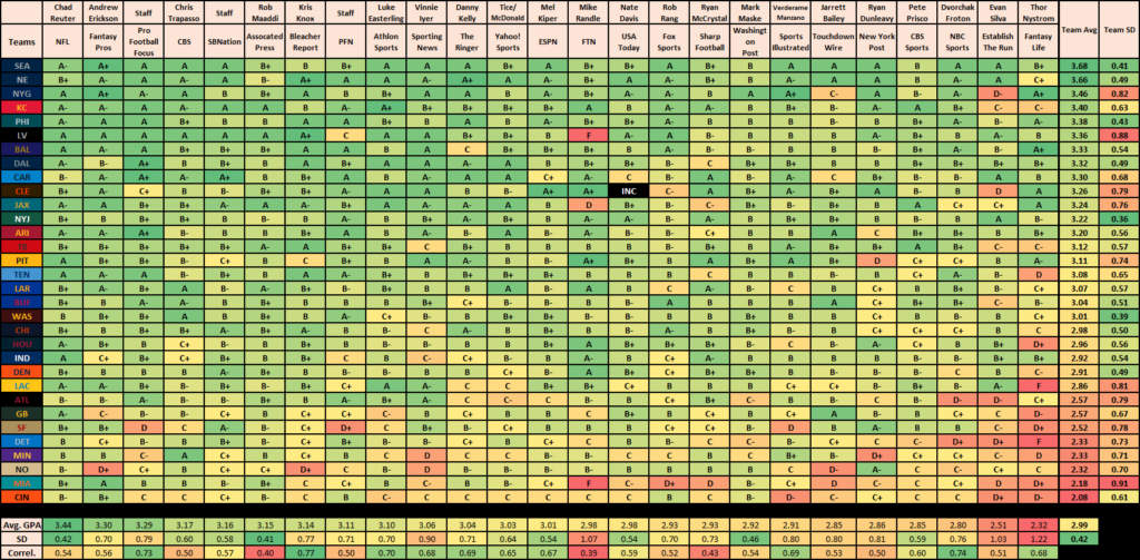 Kris Knox over at Bleacher Report was the closest to consensus, with a 0.77 correlation between his grades and the sample’s average. He was only off by a full letter grade on two teams, being unusually hard on the Saints (D+) and Steelers (C).