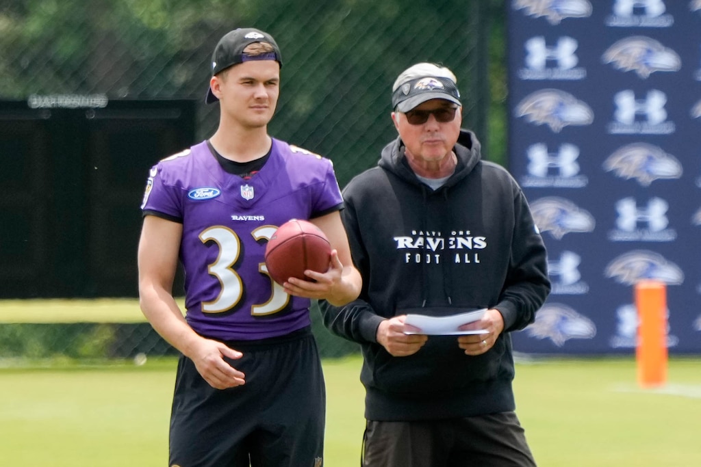 Kicker Tyler Loop (33) and senior special teams coach Randy Brown observe the team’s organized team activities. (Ulysses Muñoz/The Baltimore Banner)