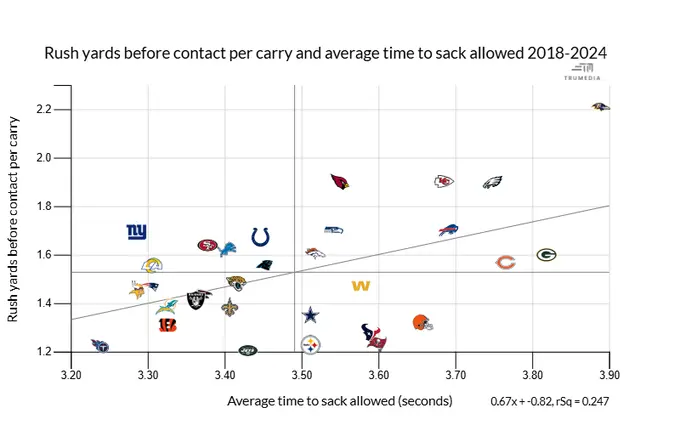 The run-game impact in particular can’t be overstated: Jackson’s gravity in the read option game has helped the Ravens rank second in specific *RB* rush yards before contact over the last five years to only the Eagles. Not too shabby!