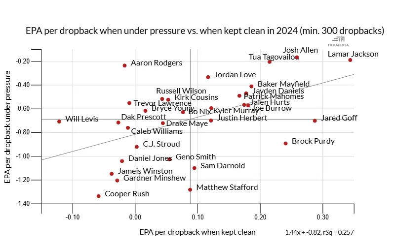 Given the presence of Lamar, Josh Allen, Jayden Daniels, and Jalen Hurts inside early top-50 ADP, we’ll use that as a cutoff for our mini study.