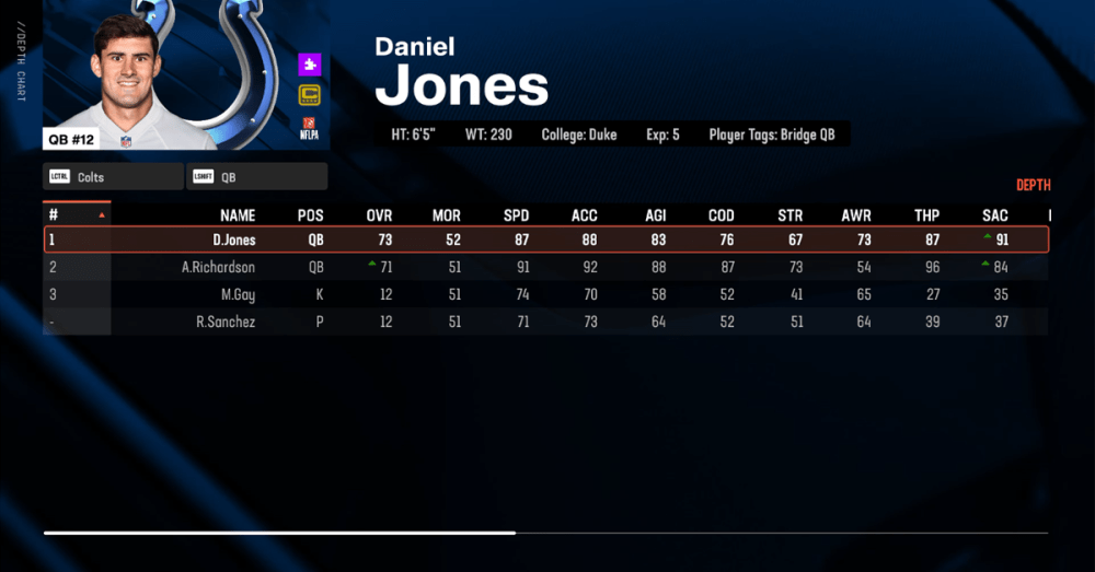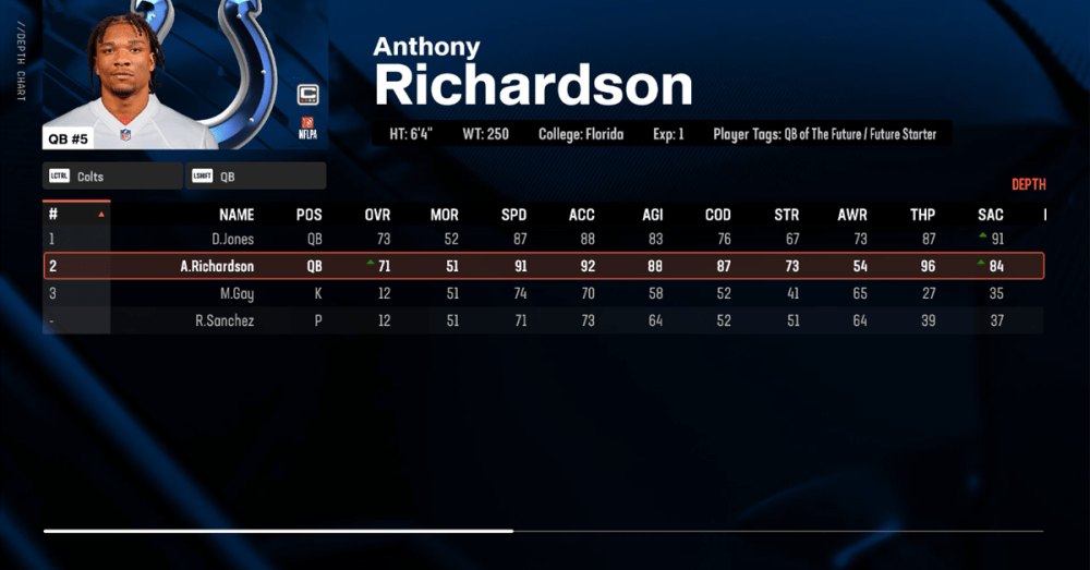 The first thing you’ll notice about the Madden take on the Colts QB room is that the team at EA is not enthused about the Colts or their chances this year. Richardson comes in as the lower overall rated player at just a 71. This is far from the rating you’re going to be looking for in a Super Bowl winning quarterback, however he does come with tags from the team that he is still positioned as the QB of the Future and a Future Starter.
