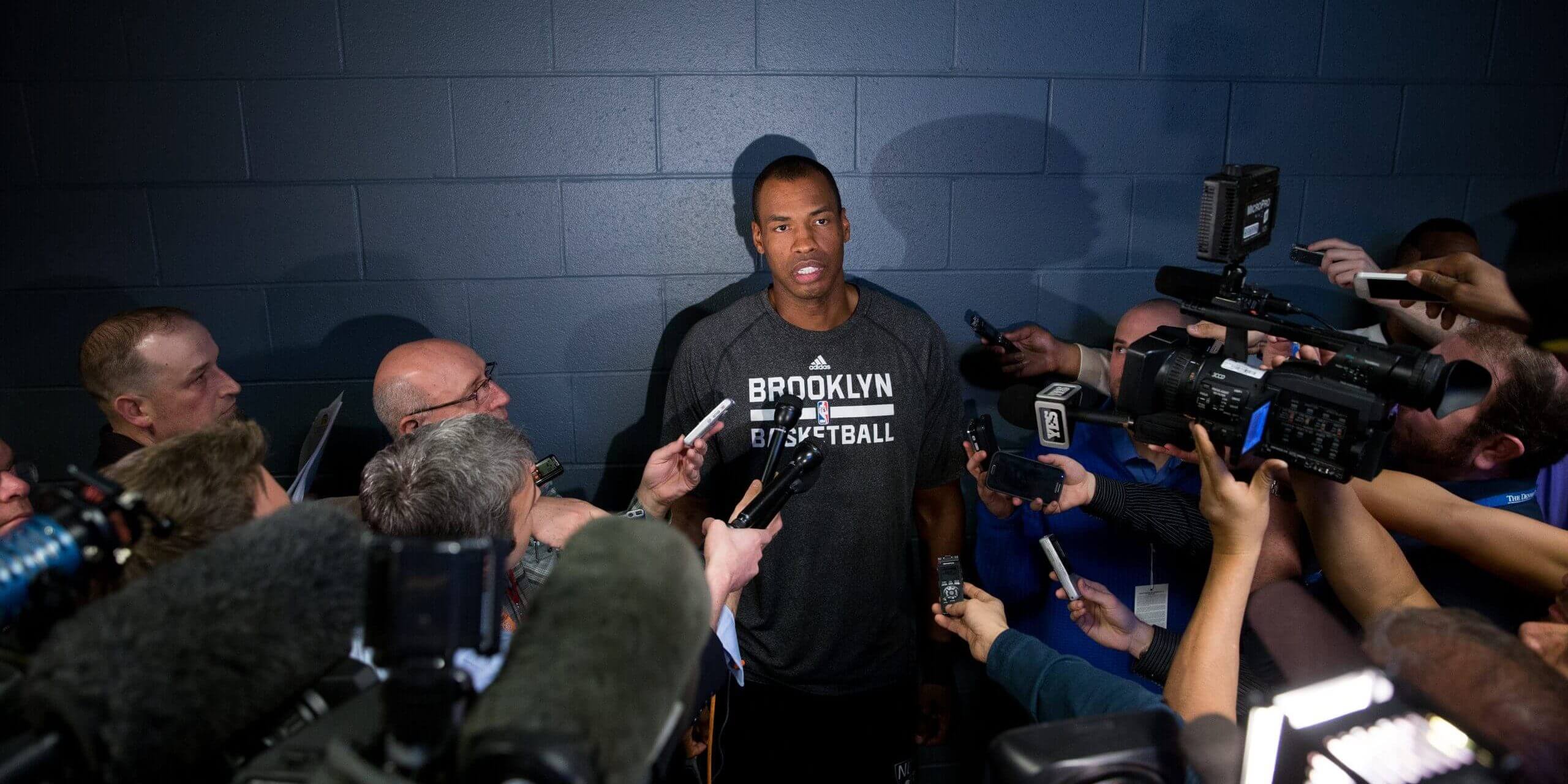 Jason Collins speaks with the media before a game in Denver in 2014. (Justin Edmonds / Getty Images)