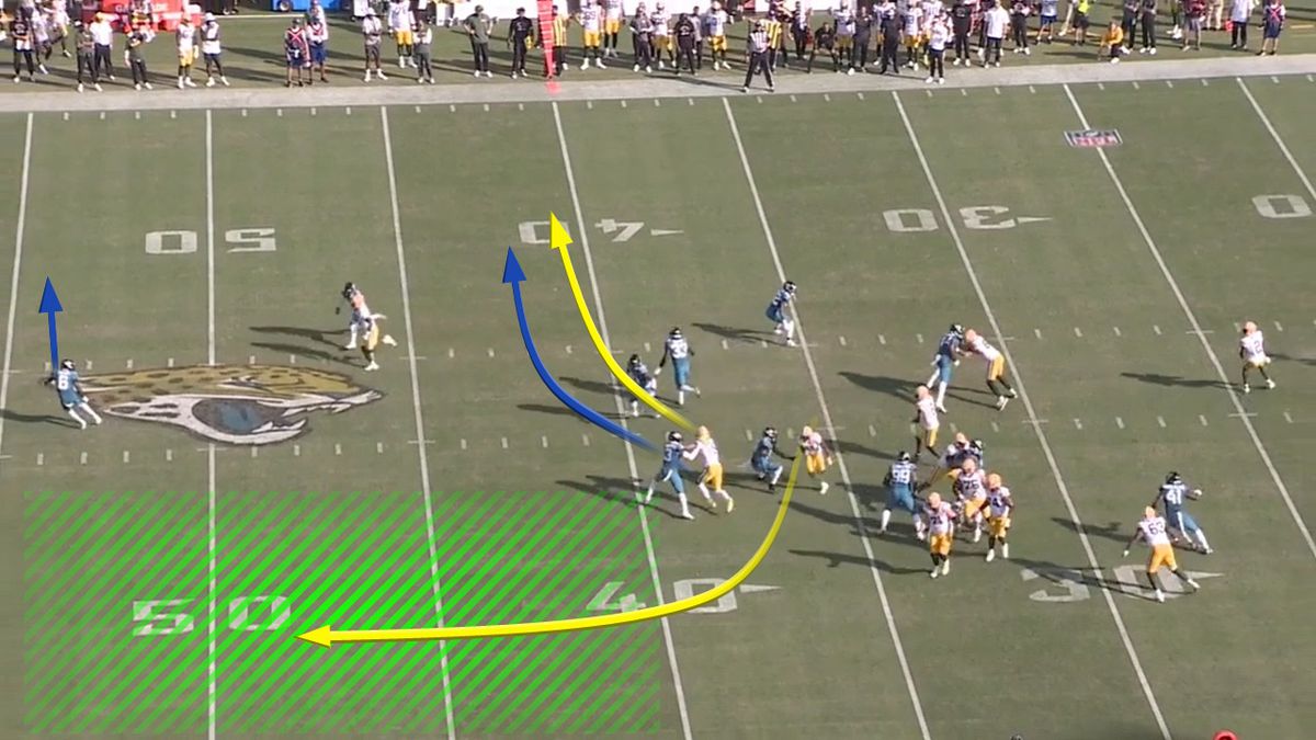 The Can likely was the result of the Jaguars’ safety rotation when they ran PA Boot earlier. On that 3rd quarter play, the Jaguars showed single-high safety pre-snap with the corners walked up. When the Packers ran Sail, the safety vacated the middle to follow the flow of the receivers with the boot, leaving the entire left side of the field wide open.