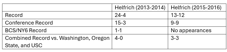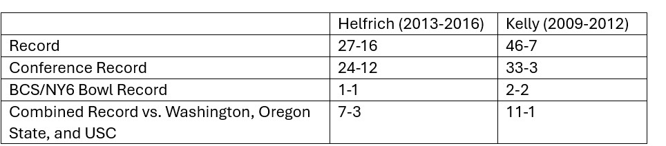 Here’s a comparison of Helfrich’s four seasons versus those of his predecessor, Chip Kelly: