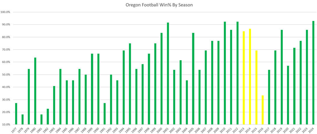 Between 1977 and 2008, the Oregon Ducks had just two head football coaches. For more than 30 years, that remarkable consistency allowed the program to steadily grow from its humble place it occupied in the early to mid-1970s to the national presence it enjoys today.