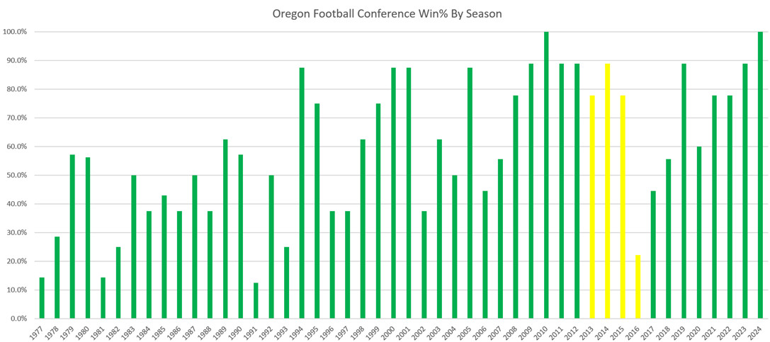 Here is Oregon’s winning percentage and conference winning percentage in Mark’s seasons:
