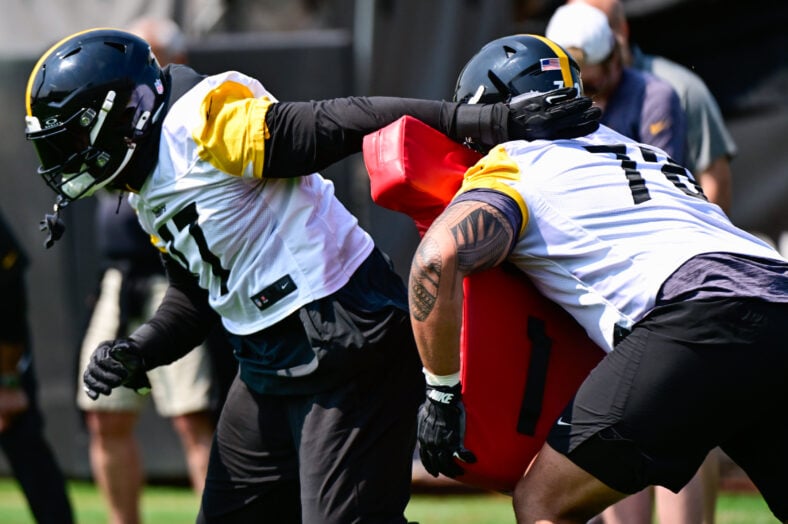 Pittsburgh Steelers offensive tackles Broderick Jones and Troy Fautanu at practice on June 3, 2025 — Ed Thompson / Steelers Now