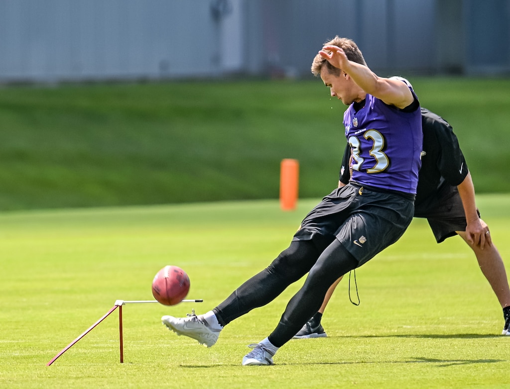 Kicker Tyler Loop works out during Friday’s OTAs. (Jerry Jackson/The Baltimore Banner)