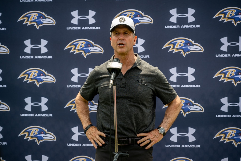 Coach John Harbaugh speaks to the media following Friday’s OTAs. (Jerry Jackson/The Baltimore Banner)