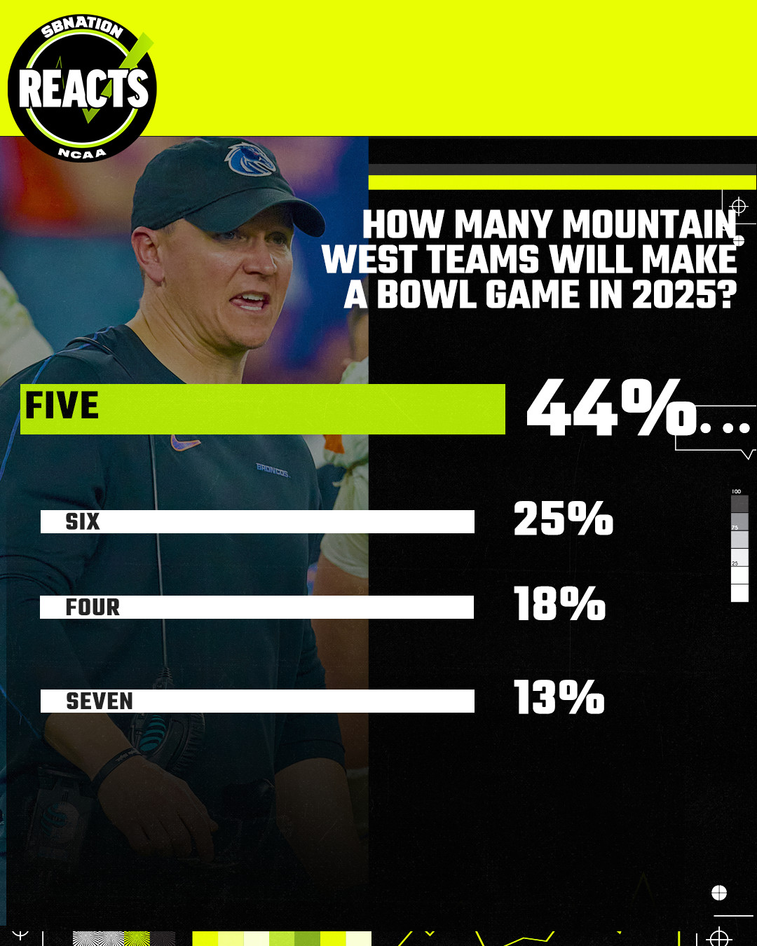 After having five bowl teams in 2024, the majority of the voters believe the Mountain West will once again have five bowl teams. While that isn’t a bad number, it’s still down from the few years prior where they had six and seven teams make a bowl game. For what it’s worth, a quarter of the voters think the MW will reach six teams.
