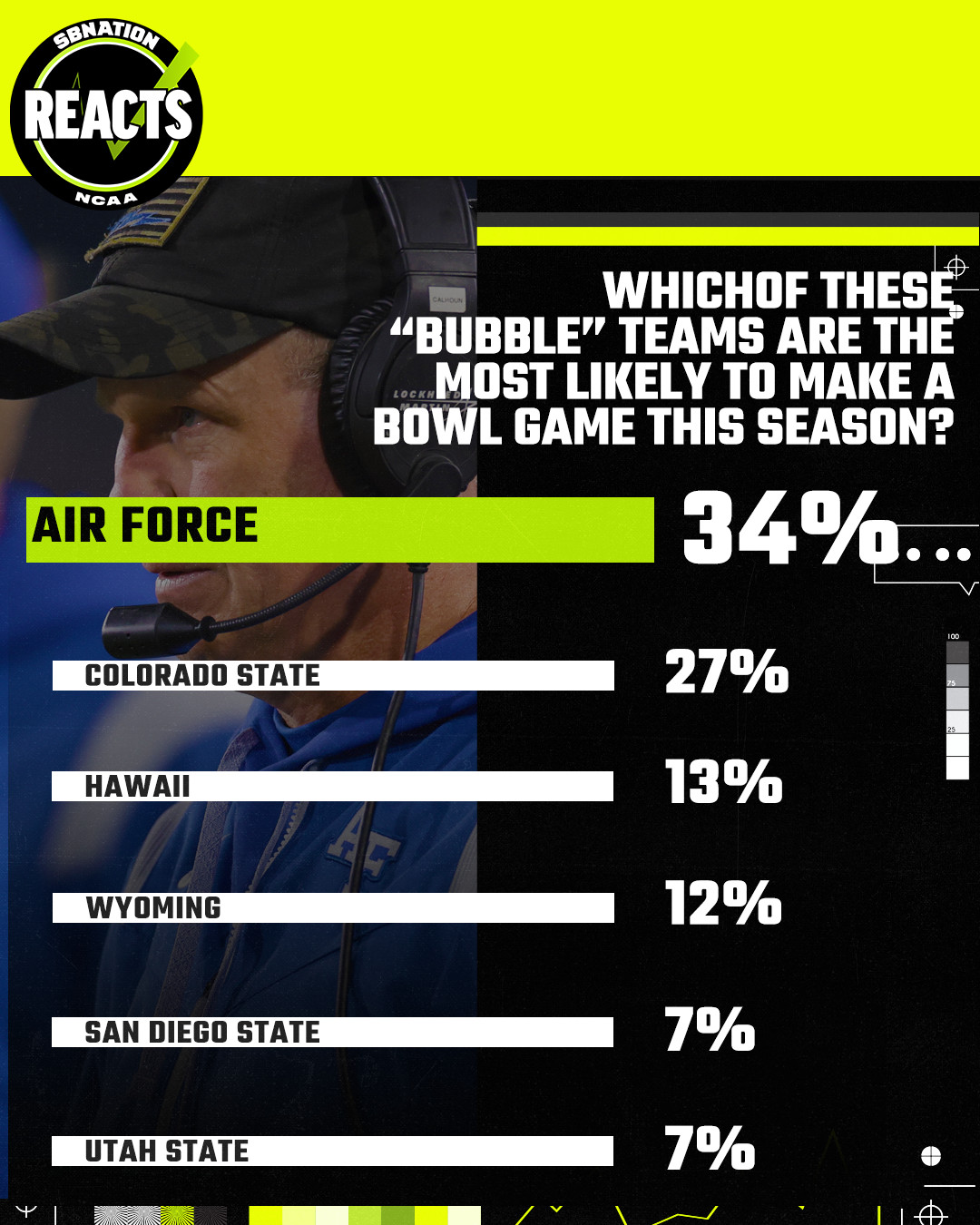 This poll question isn’t taking into account the teams most likely to make a bowl game, like Boise State and UNLV. Instead, it looks at the group with little separation entering the season. Out of these six, one-third of fans believe Air Force will bounce back and make a bowl game. Over a quarter of fans think the Rams will go bowling two seasons in a row.