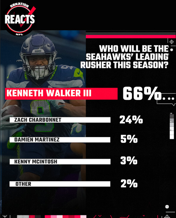 Speaking of rushing the football, another question asked of Seahawks fans this week was who they think will lead the NFL in rushing yards this season. With the top four running backs being options, Kenneth Walker III led the polling with 66% of the vote. In second came Zach Charbonnet at 24%. Damien Martinez and Kenny McIntosh came in third and fourth with 5% and 3% respectively.