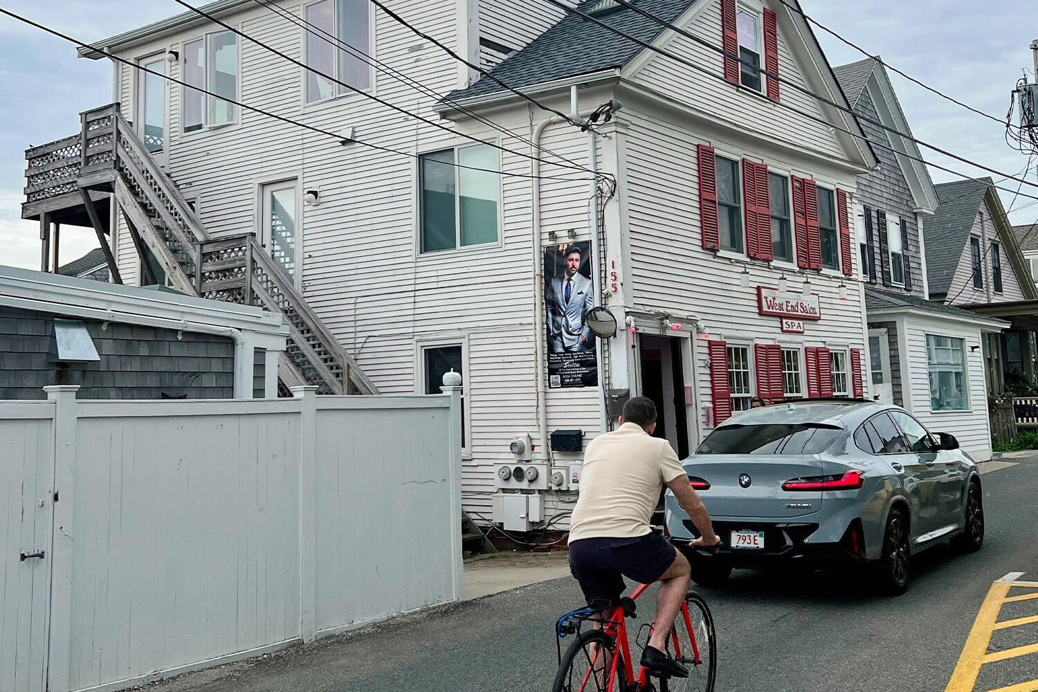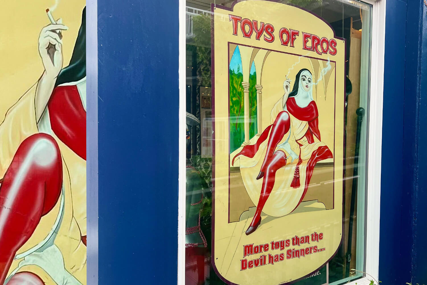Hudson — plus her mother and siblings — moved here around 2010, after Frenchmans Bay finally went under. The census from the same year found that Provincetown registered the highest rate of same-sex couples of any municipality in the country. Evidence of that is everywhere, including the countless variations of pride flags flying down Commercial Street. Hudson’s mother, Lee, now co-owns one of Ptown’s dueling LGBTQ+ sex shops, Toys of Eros, on that very thoroughfare, where a window decal of a nun smoking a cigarette and an accompanying slogan welcome couples of all ages and orientations: More toys than the Devil has Sinners …