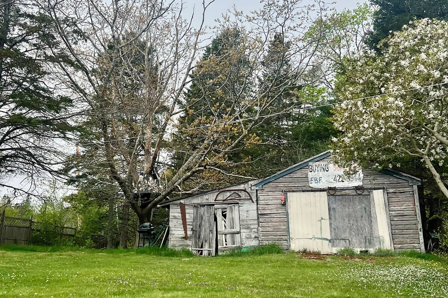 A dilapidated wooden shed out back, with a tattered sign advertising scallops. The rotting tree house next to it, which Heath once built for Hudson and her sisters to play in.