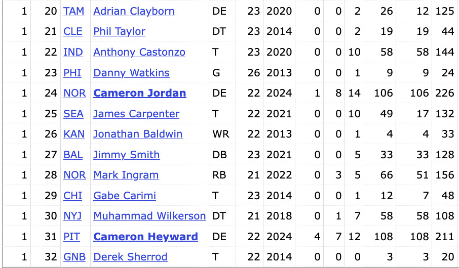Here are the top 32 players from that draft ordered by weighted Approximate Value (wAV), PFR’s metric for sustained quality of play over a career: